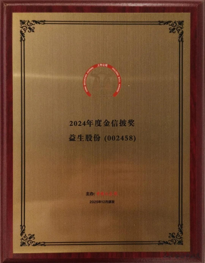 2025年12月6日由中国证券报主办的上市公司金牛奖(金信披奖)颁奖典礼在安徽合肥隆重举行,备受关注的榜单正式揭晓,益生股份凭借在信息披露和投资者关系管理等方面的卓越表现,荣获“金信披奖”。